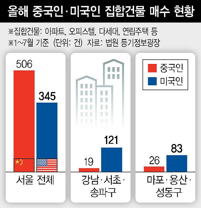 오히려 강남3구와 마용성 지역의 집을 대거 사들인 건 미국인이었다. 올해 1∼7월 미국인의 서울 집합건물 거래는 총 345건인데, 이 가운데 강남3구가 121건, 마용성이 83건으로 전체 거래량의 60%에 육박했다. 올해 서울 내 거래 건수가 100건인 캐나다인의 구입 양상도 미국과 비슷했다. 서울 강남구의 한 공인중개사는 “강남권에서 아파트를 사는 미국인은 대부분 한국계 미국인”이라며 “교포가 아닌 외국인 거래는 받아본 적이 없다”고 말했다.