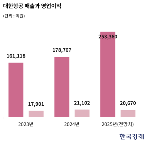 투자 긍정 요인으로는 아시아나 인수 완료에 따른 글로벌 10위 항공사 도약과 견조한 여객 수요, 친환경 고효율 신형 항공기 도입 등이 꼽힌다. 다만 항공기 리스 비용을 달러로 내는 만큼 환율에 출렁이고 중동 등 전쟁 시 여객 수요가 줄어들 수 있는 점은 위험 요인이다.