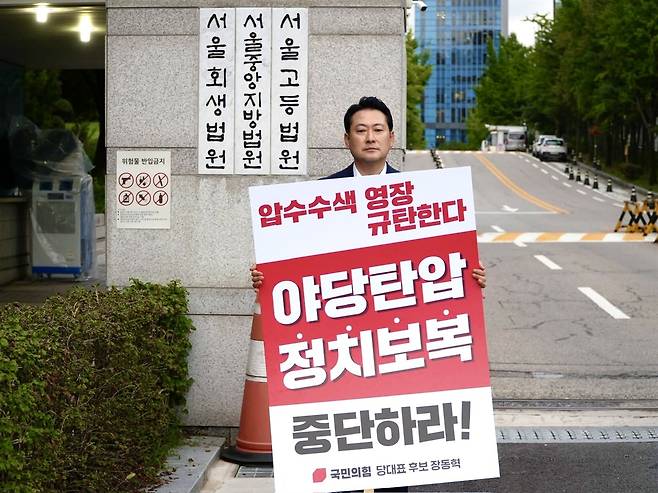 국민의힘 당 대표에 출마한 장동혁 의원은 14일 서울중앙지방법원 앞에서 '압수수색 영장 규탄한다, 야당탄압 정치 보복 중단하라'는 손팻말을 들고 항의했다.
