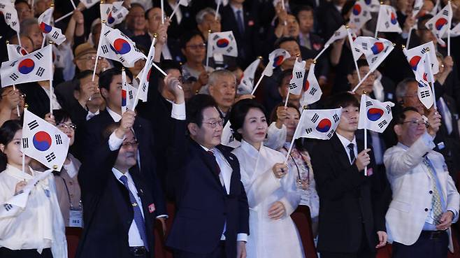 ▲ 이재명 대통령과 김혜경 여사가 15일 서울 세종문화회관에서 열린 80주년 광복절 경축식에서 참석자들과 만세 삼창을 한 뒤 태극기를 흔들고 있다.