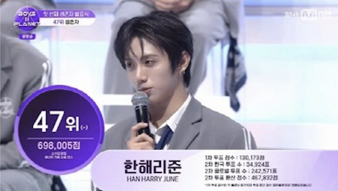 '보이즈 2 플래닛'은 지난 14일 8회를 방송했다. 한해리준은 첫 번째 생존자 발표식에서 47위로 살아남았다.