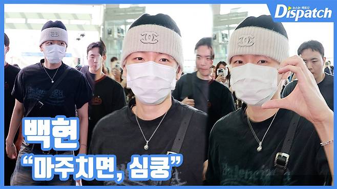이날 백현은 비니에 블랙 티셔츠와 데님 팬츠를 매치해 힙한 분위기를 발산했다.