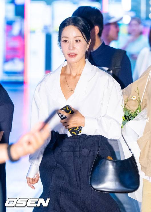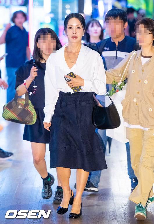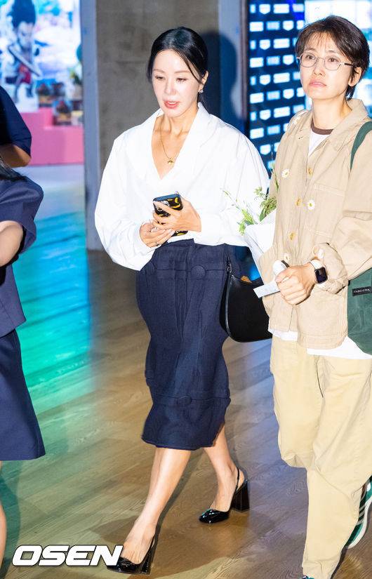 엄정화는 화이트 블라우스와 블랙 A라인 스커트를 매치해 단정하면서도 세련된 스타일을 선보였다.