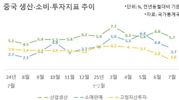 투자 상황은 더 부진했다. 올해 1~7월 고정자산 투자는 전년동기대비 1.6% 증가에 그쳐 시장 예상치(2.7%)에 못 미쳤다.