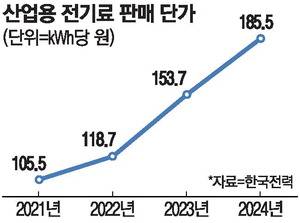 정부가 산업용 전기료만 잇달아 올리며 2022년부터 지난해까지 산업용 전기료는 70% 급등했다. 같은 기간 가정용 전기료가 37% 상승한 것을 감안하면 2배 수준의 상승폭이다.