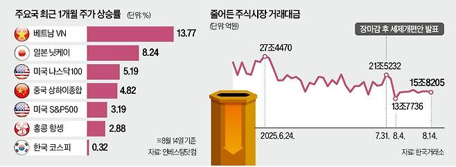 올해 상반기까지만 해도 코스피지수는 주요국 증시 중 상승률 1위를 기록했다. 상법 개정안이 통과되는 등 강력한 정부 정책이 ‘코리아 디스카운트’를 해소할 것이라는 기대가 시장을 밀어 올렸다. 분위기가 반전된 것은 지난달 말 내년도 세제개편안이 공개되면서다. 배당소득 분리과세 방안과 주식 양도세 대상인 대주주 기준 강화 등이 투자자 기대에 못 미쳤다는 평가가 나왔다.