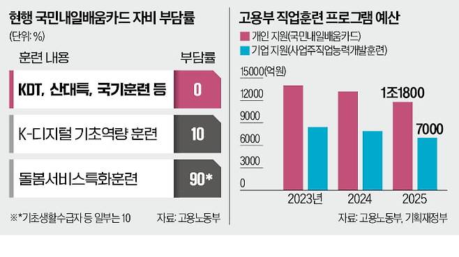 정부는 교육 활성화를 위해 자비 부담률을 0%까지 낮춘 일부 프로그램이 도덕적 해이 등 부작용을 초래한다고 보고 있다. 2020년 말 신설된 K-디지털 트레이닝(KDT), 산업구조변화대응특화훈련(산대특) 등이 대표적이다. 로봇, 인공지능(AI) 등 첨단산업 취업 희망자를 위한 직업훈련인데, 소득 수준과 관계없이 누구나 공짜로 수강할 수 있다.