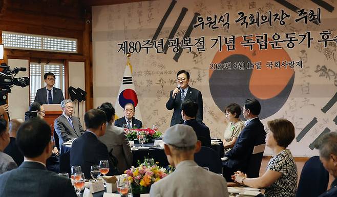 ▲ 15일 서울 여의도 국회 사랑재에서 열린 80주년 광복절 기념 독립운동가 후손 초청오찬에서 우원식 국회의장이 인사말을 하고 있다.