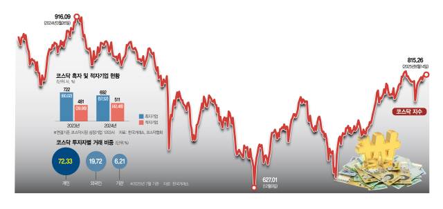 부실 기업이 줄어들지 않는 점도 코스닥 시장을 소외받게 한 원인이다. 코스닥 상장폐지법인(스펙, 이전상장 제외)은 2023년 12개에서 지난해 22개사로 10개 늘어났다. 기업들의 실적 악화도 코스닥 동력을 떨어뜨린다. 한국거래소에 따르면 코스닥 12월 결산 상장기업 1203사의 지난해 연결기준 영업이익은 2.71% 감소한 9조 6403억 원이며, 이들 중 42.48%(511사)가 적자를 기록했다. 실적 악화는 코스닥 상장 기업들의 ‘성장성’ 결여로 비춰져 투자를 꺼리게 할 수 있다는 해석이 나온다.