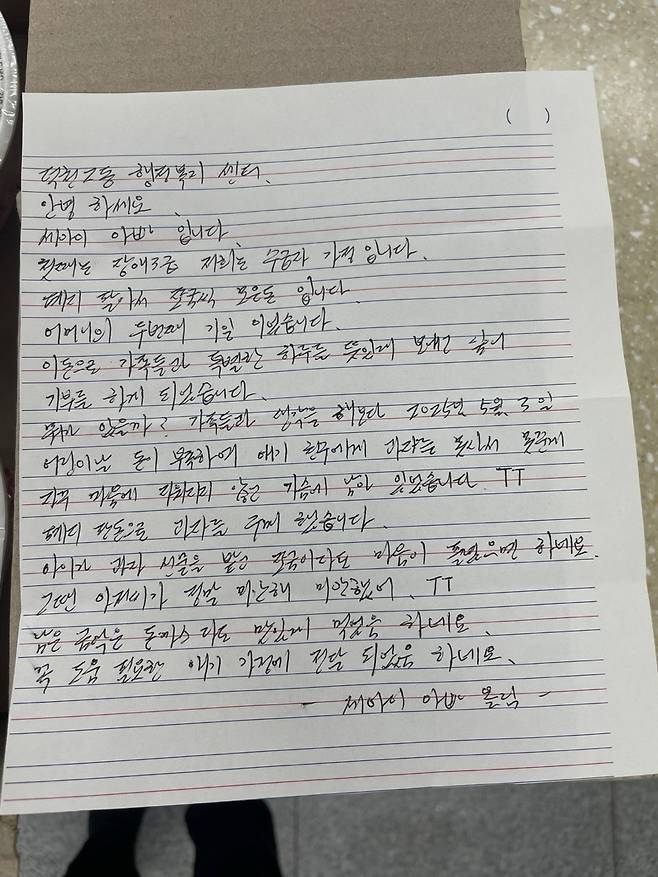 경찰이 상자를 열어보니 상자 안에는 라면과 과자, 1000원짜리 지폐 30장, 손 편지가 들어있었다. 손 편지에는 자신을 세 아이의 아빠이자 기초수급자 가정의 가장이라고 소개한 남성은 “어머니의 두 번째 기일을 맞아 가족들과 특별한 하루를 보내고 싶어 폐지를 팔아 조금씩 모은 돈을 기부하기로 결정했다”며 “지난 5월 어린이날 돈이 부족해 어린이들에게 줄 과자를 사지 못한 것이 못내 마음에 걸려 과자를 샀다”고 적었다.