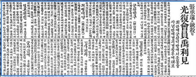 1921년 6월 11일자 <동아일보> 기사 제목이다. 기록에 따르면 '광복회'는 1915년 대구에서 창립된 '무장투쟁 항일결사체'였다. 회원은 200여 명. 그들은 친일파 처단, 일본 헌병대 공격, 현금 수송차 탈취, 일본인 금광 습격 등의 무장 투쟁을 펼쳤다. 1916년에는 각 도와 만주에까지 지부를 설치하는 등 전국에 조직망을 갖춰 3.1운동과 의열단 창단 밑거름이 된다.