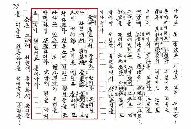 | ▲ 기생 강국향, 형사 최기배, 김병순 세 사람이 창평에 머물고 있던 우재룡을 택시에 태워 군산까지 안전하게 안내했다는 대목(붉은 줄) |