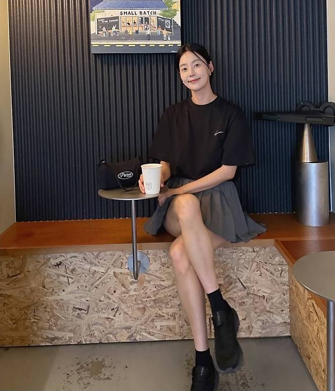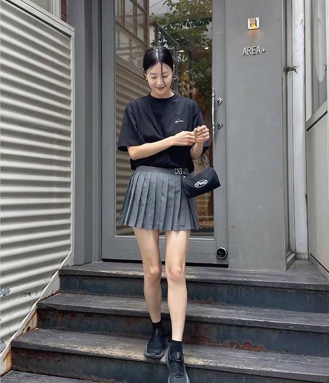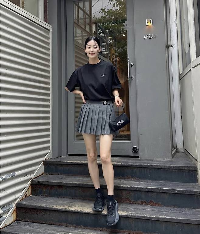 172cm·47kg의 한지혜는 14일 자신의 SNS를 통해 블랙 오버핏 티셔츠와 회색 플리츠 미니스커트를 매치한 사진을 올렸다.