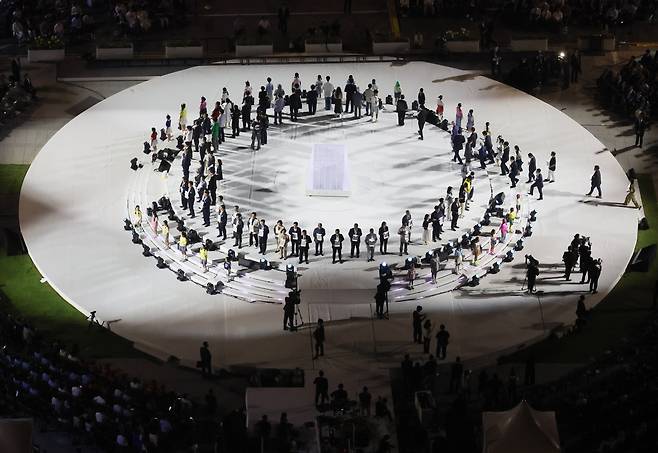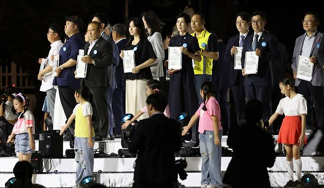 | ▲ 15일 서울 광화문광장에서 열린 제21대 대통령 국민임명식 행사에서 80인의 국민대표들이 무대에 올라와 있다. 2025.8.15 |