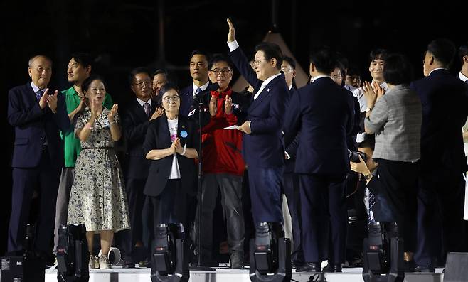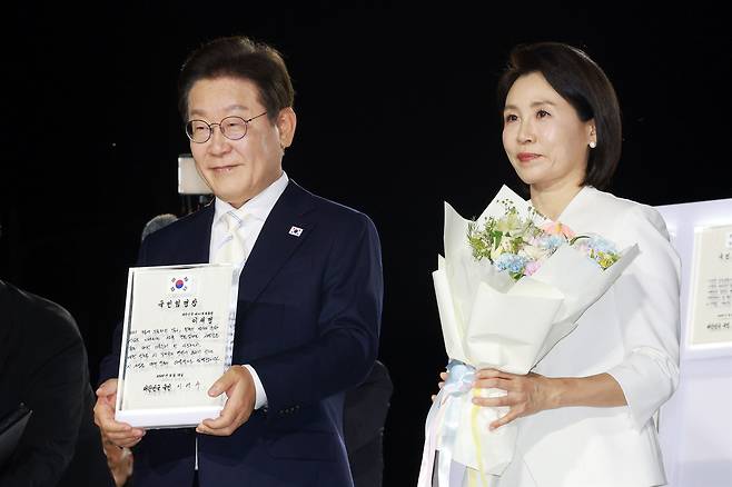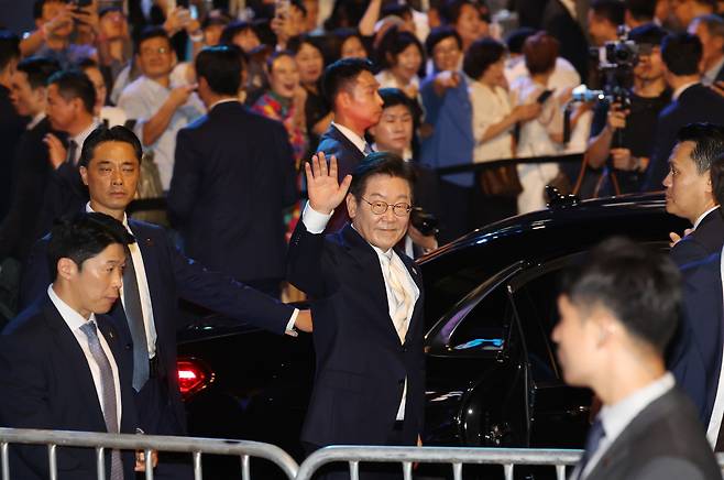 이재명 대통령은 이날 오후 8시 25분께 광화문 광장에 도착했다. 남색 정장에 흰색 넥타이를 맨 이 대통령은 흰 원피스를 입은 김혜경 여사와 나란히 걸으면서 지지자들과 인사를 나눴다. 공개된 석상에서 대통령이 일반 시민과 접촉할 수 있도록 '열린 경호'가 이뤄진 것도 눈에 띄었다. 시민들도 "이재명"을 연호하면서 환호했고, 이 대통령은 몇몇 시민들과 하이파이브를 하며 고마움을 표시했다.