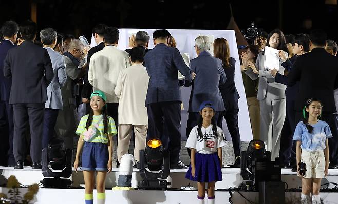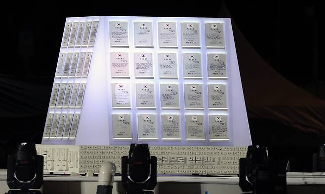| ▲ 국민대표 80인이 15일 오후 서울 종로구 광화문광장에서 열린 제21대 대통령 국민임명식에서 무대 위로 올라와 대형 큐브에 자신이 직접 쓴 임명장을 올려놓고 있다. |