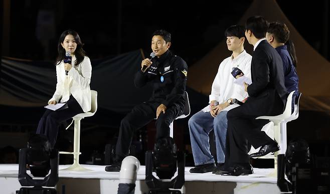 | ▲ 영덕 산불 당시 고립된 주민들을 구했던 김해인 울진해양경찰서 경위와 국내 최초 자연 임신으로 다섯 쌍둥이를 출산한 김준영, 사공혜란씨 부부가 15일 오후 서울 종로구 광화문광장에서 열린 제21대 대통령 국민임명식에 초대되어 이야기를 나누고 있다. |