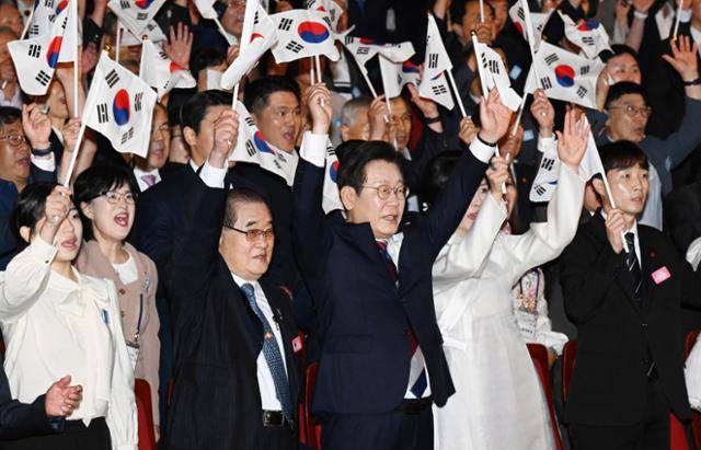 이재명 대통령이 15일 서울 종로구 세종문화회관에서 열린 제80주년 광복절 경축식에 참석해 태극기를 흔들며 만세 삼창을 외치고 있다. 역사 왜곡 논란이 불거진 독립기념관장 인선 논란으로 여야가 따로 기념식에 참석해 '반쪽 광복절'로 쪼개졌던 지난해와 달리, 이날 행사는 모든 독립단체와 여야 모두 하나 돼 광복의 뜻을 기렸다. 왕태석 선임기자