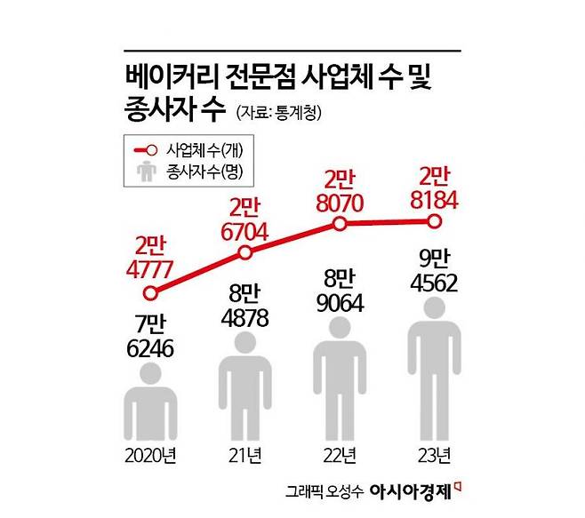 제과·제빵 관련 자격증 소지자들이 베이커리·디저트 카페로 나오면서 제과점업 종사자 수는 ▲2020년 7만6246명 ▲2021년 8만4878명 ▲2022년 8만9064명 ▲2023년 9만4562명으로 꾸준히 증가하는 추세다. 사업체 수도 ▲2020년 2만4777개 ▲2021년 2만6704개 ▲2022년 2만8070개 ▲2023년 2만8184개로 늘었다.