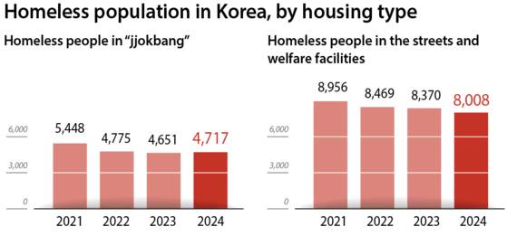 While the number of people living on the streets has steadily declined from 2021 to 2024, Welfare Ministry data shows that the population of jjokbang residents rose slightly, from 4,651 in 2023 to 4,717 in 2024. This indicates that although the homelessness situation is consistently improving, the issue of inadequate housing is slower to improve.