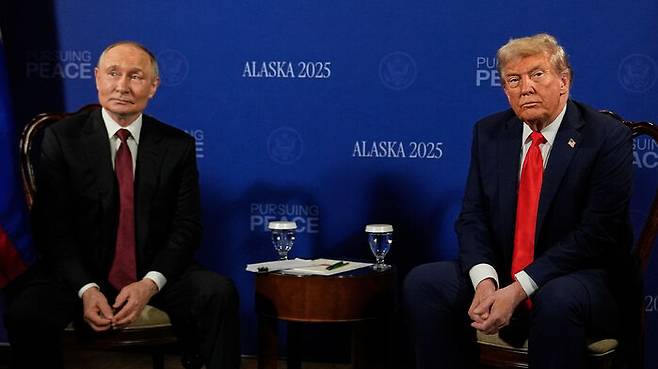 ▲ 도널드 트럼프 미국 대통령(오른쪽)과 블라디미르 푸틴 러시아 대통령이 15일(현지시간) 미국 알래스카주 앵커리지에 있는 엘먼도프 리처드슨 합동기지에서 회담하고 있다.