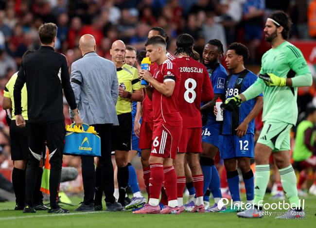 매체는 "테일러 주심은 대기심과 이야기한 뒤 리버풀 아르네 슬롯 감독과 본머스 안도니 이라올라 감독을 불러 상황을 설명했다. 경기는 재개됐고 전반 종료 휘슬이 울린 뒤 관중들에게 반차별 메시지가 전해졌다"라고 더했다.