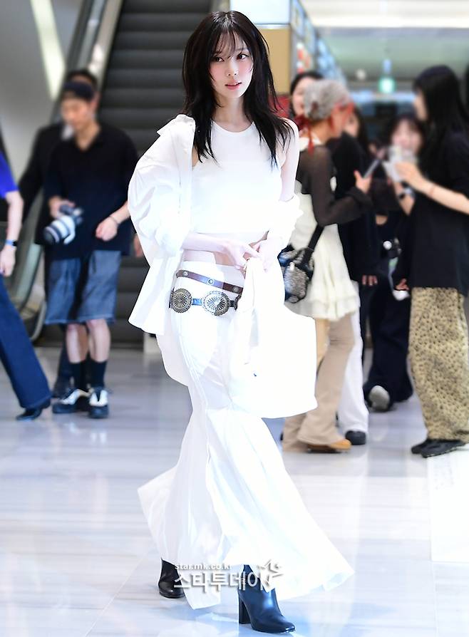내추럴 화이트 셔츠의 여유로움과 웨스턴 메탈 장식의 브라운 벨트로 허리 라인을 강조하며, 전체적으로 미니멀한 톤에 유니크한 포인트를 더했다.