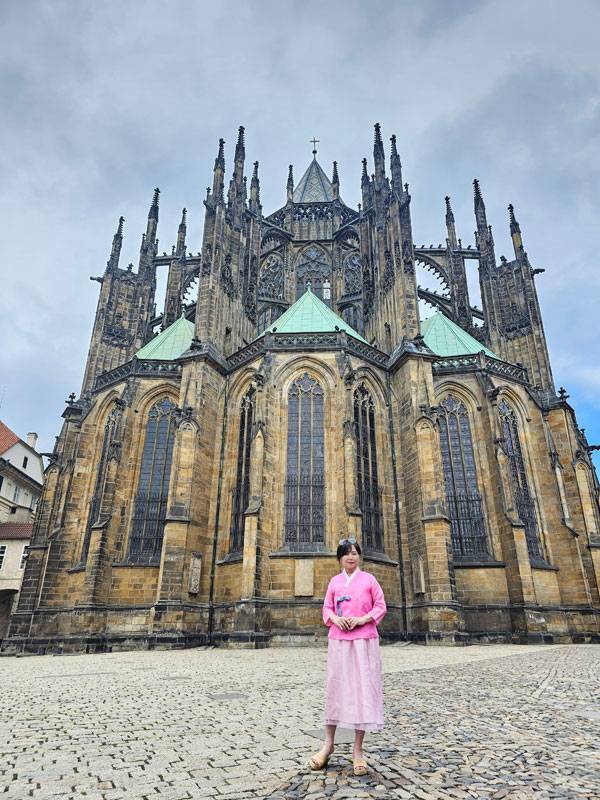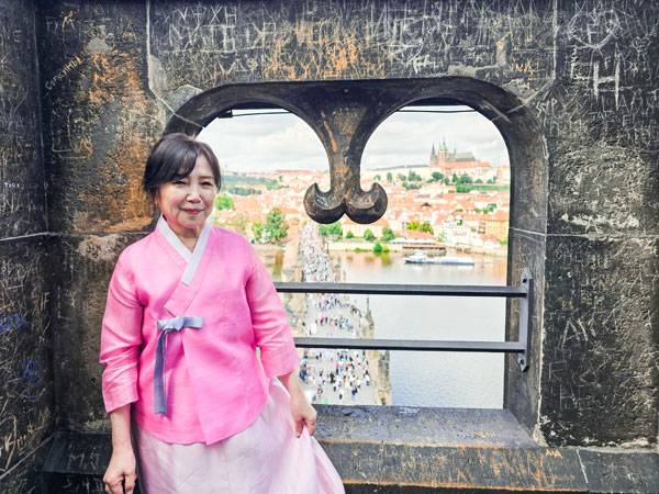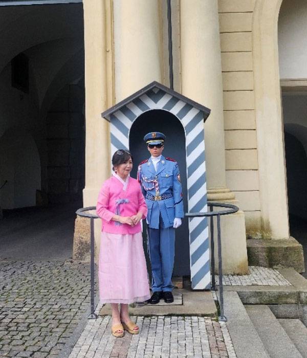 그중 까를교. 처음 〈꽃보다 할배〉 시리즈에서 봤는데 까를교에서 바라보는 야경이 너무나 아름다웠다. 그런데 나중에 다른 여행 프로그램을 보니까 '까를교' 위를 걸으면서 구경을 하는 코스인데 배우들 연세를 감안해서 그냥 노천카페에 앉아서 감상을 하셨던 거다. 실제로 가보니 주탑에 올라야 비로소 드론으로 찍은 장면 같은 경치가 펼쳐졌다. 한복을 입고 사진을 찍었는데 굳이 한복을 입은 이유가 있다. 프라하 국립박물관에 전시되어 있다는 한복 앞에서 사진을 찍고 싶었다. 그러나 동선 문제로 가지 못했고 대신에 프라하성 여성 근위병과 사진을 한 장 찍었다.