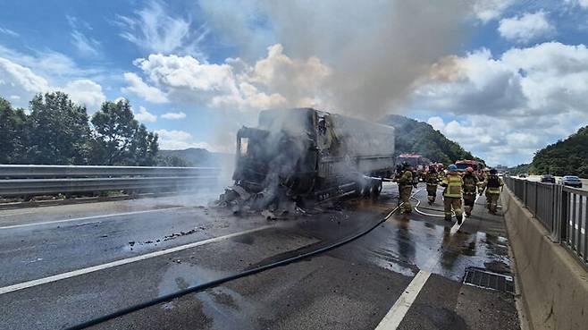 이 사고로 17t 화물차에서 불이 나 전소됐고, 20t 화물차 일부도 탔습니다.