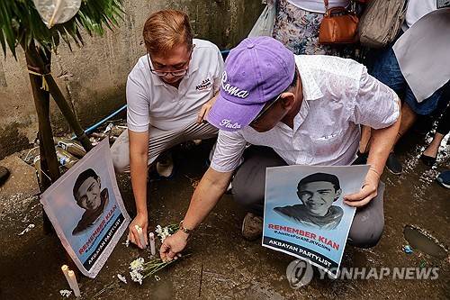 epaselect epa12303922 Randy delos Santos (R), uncle of killing victim Kian delos Santos, lays flowers at the sight where his nephew was shot and killed by police eight years ago in Caloocan City, Metro Manila, Philippines, 16 August 2025. Human rights advocates marked the eighth death anniversary of delos Santos, who was among thousands documented to have been killed under extra-judicial circumstances during the war on drugs campaign of former President Rodrigo Duterte, who is currently detained in The Hague and faces charges of crimes against humanity. EPA/ROLEX DELA PENA