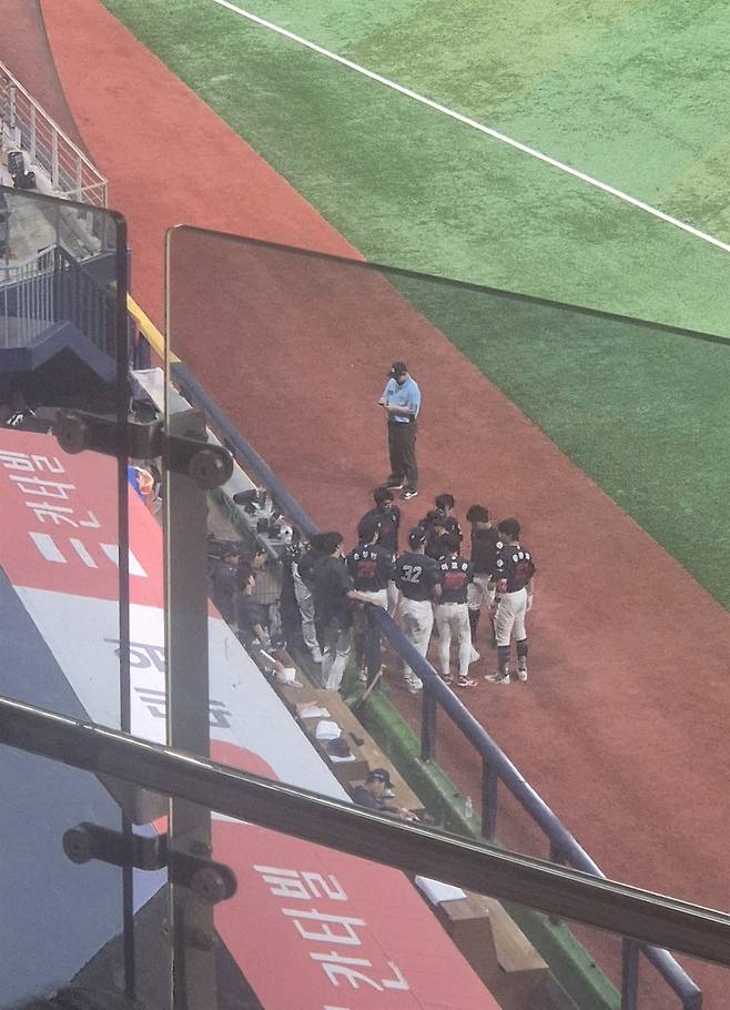 | ▲ 수비가 끝난 후. 수비를 마친 야수들이 더그아웃 앞에서 고생한 투수를 격려하고 있다. |