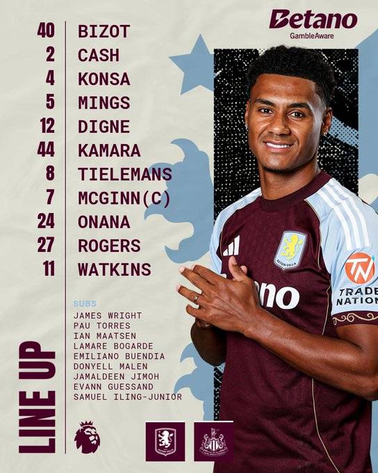 애스턴 빌라는 4-2-3-1 전형으로 맞섰다. 마르코 비조트가 골키퍼 장갑을 꼈다. 매티 캐시, 에즈리 콘사, 타이론 밍스, 뤼카 디뉴가 수비라인을 이뤘다. 부바카르 카마라, 아마두 오나나가 허리를 받쳤고, 모건 로저스, 유리 틸레망스, 존 맥긴이 2선에서 공격을 지원했다. 최전방 원톱은 올리 왓킨스가 맡았다.