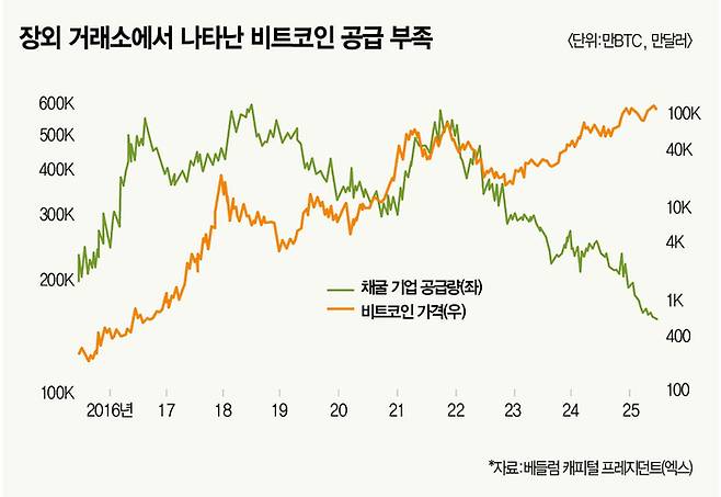 이유는 명확하다. 비트코인 시장이 개인에서 기관과 기업 주도 장세로 완전히 바뀌었기 때문이다. 지난해 초 비트코인 현물 상장지수펀드(ETF) 승인으로 기관 매수세가 커지더니 지난해 4분기부터는 아예 기업이 매수를 주도하며 새로운 국면을 맞이하고 있다. 기업과 기관 ‘쌍끌이 수요’로 인해 장외 거래소 비트코인 물량이 빠른 속도로 고갈되는 중이다.