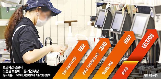정부는 먼저 연차·공휴일·퇴직금 관련 규정은 2027년부터, 주휴수당 규정은 2028년부터 적용한다는 방침이다. 고용부는 확대 조치가 실시될 경우 사업주에게 연간 1조3709억 원의 추가 비용이 발생할 것으로 추산했다(시급 1만30원 기준). 주휴수당 8907억 원, 공휴일·대체공휴일 2840억 원, 연차유급휴가 1962억 원이다. 주5일 근로하는 정규 근로자 기준으로 임금만 20%가 인상되는 효과가 있기 때문이다.