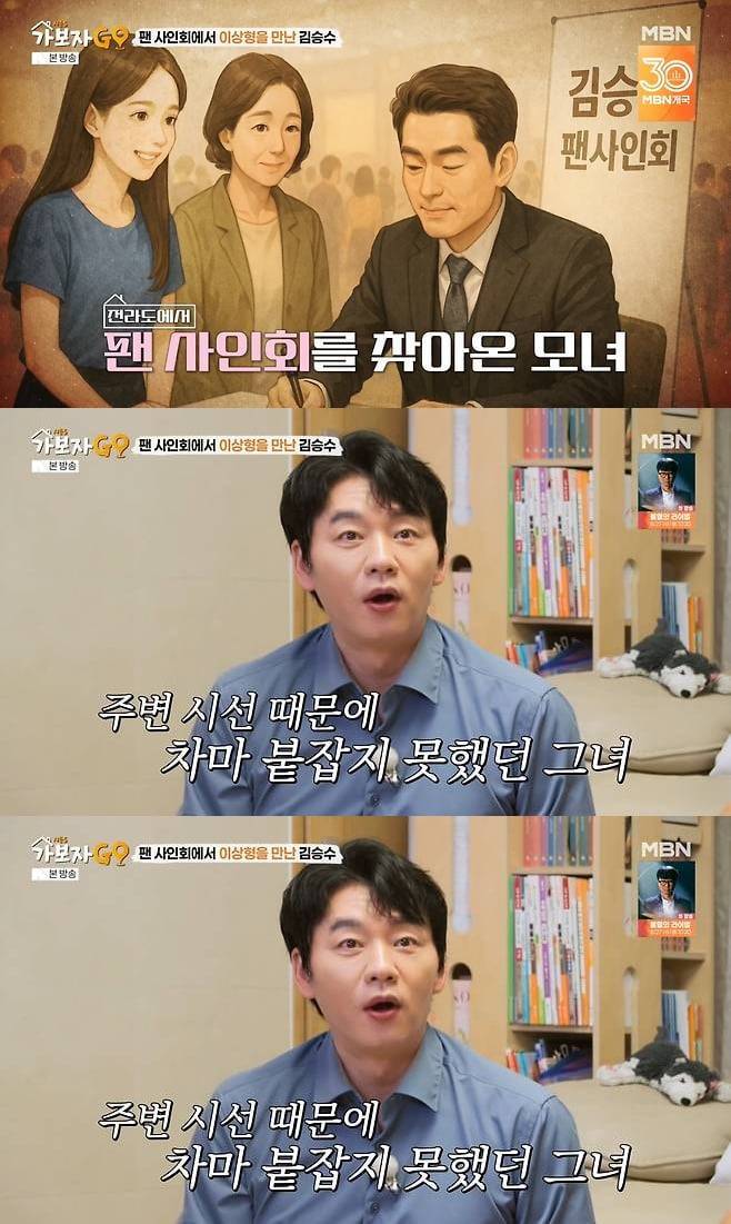 김승수는 영상 편지를 남기라는 말에 "가좌동 매장에서 사인회 했던 날, 전라도 쪽에서 올라온 어머님과 따님. 블루 계열 옷을 입으셨는데, 상황이 그래서 말을 못 건넸다. 저는 혼자 자유로운 몸이다. 같이 식사라도 하자"고 공개 구혼했다.