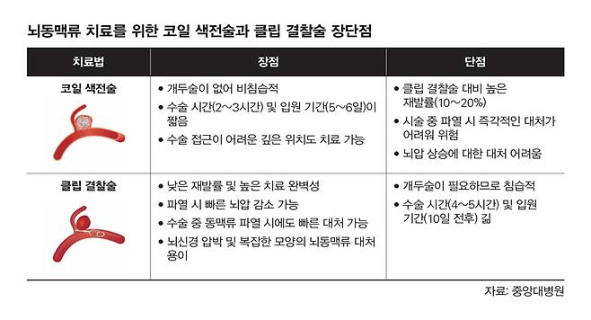 뇌동맥류 치료는 크게 두 가지 방법이 있다. 하나는 혈관 내로 접근해 치료하는 '코일 색전술'이고, 다른 하나는 두개골을 열고 치료하는 '클립 결찰술'이다. 이 두 치료법은 치료 효과와 합병증 발생률 면에서 대체로 비슷한 결과를 보인다. 남택균 중앙대병원 뇌혈관센터 신경외과 교수는 "뇌동맥류가 진단됐다고 해서 무조건 치료를 해야 하는 것은 아니며 뇌동맥류 크기, 위치, 모양, 나이 등을 고려해 코일 색전술과 클립 결찰술 중 적절한 치료법을 결정한다"고 말했다.