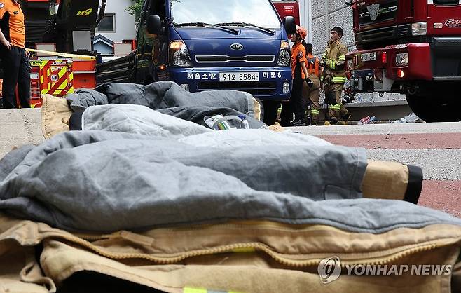 (서울=연합뉴스) 이진욱 기자 = 17일 서울 마포구 창전동 한 아파트 화재현장에 소방대원들의 방염복이 놓여 있다. 2025.8.17