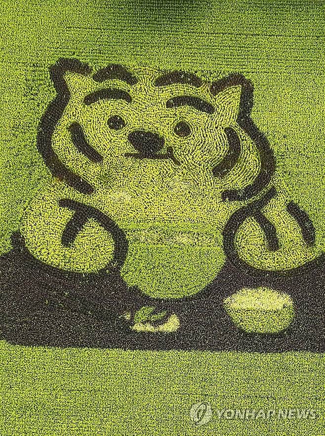 (여주=연합뉴스) 홍기원 기자 = '쌀의 날'을 하루 앞둔 17일 경기도 여주시 논에 유색 벼를 활용한 '뚱랑이' 캐릭터가 그려져 있다. 2025.8.17