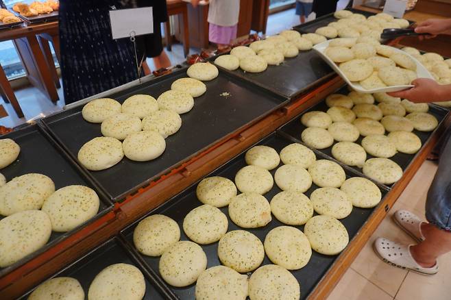 대전에 성심당이 있다면 안동에는 ‘맘모스베이커리’가 필수 코스란다. 오후 늦게는 빵이 소진되고 없을 가능성이 크니 되도록 오전에 가는 것을 추천한다. 매장에 들어서면 크림치즈빵이 겹겹이 쌓여 가장 눈에 띈다. 쟁반 가득 크림치즈빵만 담는 관광객도 눈에 띄었다. 한국관광공사 경북지사장은 "맘모스베이커리에서는 유자 파운드를 꼭 사야한다"며 "안동에 올 때마다 사가는 것"이라고 귀띔했다. 유자파운드는 1만8000원으로 주문하면 냉장고에서 꺼내준다. 다만 2시간 내에 냉장 보관 해야한다니, 구매를 고민해야 한다.