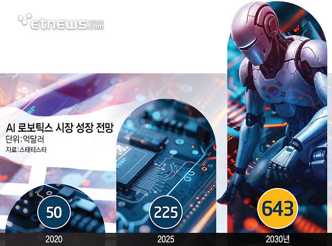 시장조사업체 스태티스타에 따르면 AI 로보틱스 시장은 오는 2030년까지 연평균 23.3% 성장해서 643억달러(약 90조원) 규모에 이를 전망이다.