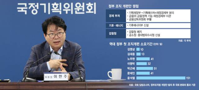 하지만 최근 금융위 해체를 놓고 대통령실의 기류가 바뀌면서 기재부 조직 개편도 뒤로 밀리는 분위기다. 가계부채 문제 등 금융 관련 과제가 산적한 상황에서 금융위를 해체하면 득보다 실이 클 것이라는 현실론이 힘을 얻고 있다는 것이다. 일각에서는 산업통상자원부의 에너지실과 환경부의 기후탄소실을 통합해 기후에너지부를 신설하는 안을 놓고도 여권 내부는 물론 대통령실 안에서 이견이 제기되고 있는 것으로 알려졌다.