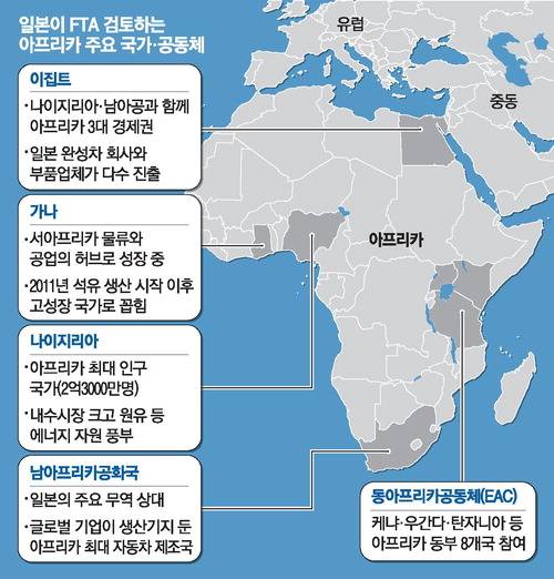 이러한 일본 정부 움직임에는 중국이 추진하는 아프리카 일대일로(육상·해상 실크로드)와 FTA 선진국인 한국 등을 견제하려는 목적도 있다. 한국은 지난해 탄자니아·모로코·케냐와 경제동반자협정(EPA) 체결을 통한 경제협력 확대 논의를 시작했다.