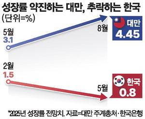 반면 한국은 지난해 말 비상계엄 여파에 따른 내수 침체와 도널드 트럼프 미국 대통령의 관세 공세로 수출이 타격을 받으면서 대만과 정반대의 상황을 맞게 됐다. 한국개발연구원(KDI)은 지난 5월 올해 경제 성장률을 0.8%로 전망했는데, 이는 지난 2월 전망치 1.6%에서 3개월 만에 절반으로 깎은 것이다.