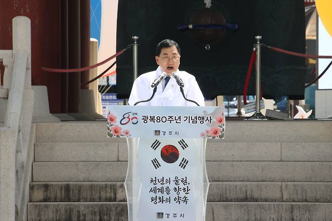 | 15일 주낙영 경주시장이 신라대종 앞 단상에서 광복 80주년 8·15 광복절 기념 경축사를 하고 있다. |