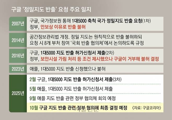한미 정상회담을 앞두고 구글 등 해외 빅테크가 신청한 고정밀 국가지도 반출 여부를 놓고 관심이 뜨겁다. 구글은 지난 2월 한국 국가 지도를 1대5000 비율로 축척한 수치지형도를 해외 데이터센터로 내보내게 해달라며 반출 허가를 신청했다. 구글이 지도 반출을 요청한 건 2007년과 2016년에 이어 세 번째다. 애플 역시 지난 5월 지도 반출을 신청했다. 정부는 그간 안보 문제를 들어 반출을 허용하지 않았는데, 최근 한미 통상협상을 거치며 다시 수면 위로 떠오른 모습이다. 구글코리아는 지난 5일 자사 블로그에 올린 글에서 한국 정부가 지도 반출을 허용하지 않아 한국에서만 이용자가 구글 지도 서비스를 받지 못해 불편을 겪고 있다고 주장했다. 그러나 정부는 국내 서버 설치 없이 고정밀 지도를 내줄 경우 보안시설 노출 같은 안보 문제가 발생할 수 있다며 ▲위성 사진에서 보안시설 가림 처리 ▲상세 좌표 삭제 ▲국내에 데이터센터(서버) 설치 등을 요구했다. 지도 반출 여부를 결정하는 정부 협의체가 지난 8일 최종 결정을 10월로 연기한 가운데 관련 쟁점을 Q&A 형식으로 짚어 봤다.