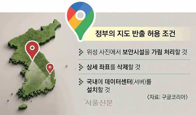 A. 이 정도로는 안보 문제를 해소할 수 없다는 게 정부의 판단이다. 정부가 제시한 조건은 ▲위성 사진에서 보안 시설 가림 처리 ▲상세 좌표 삭제 ▲국내에 데이터센터(서버) 설치 등 세가지로, 구글은 이 가운데 한 가지만 받아들이겠다고 했다. 특히 국내 데이터센터 설치에 대해선 국내에 서버를 두더라도 길 찾기 기능이 제대로 작동하려면 전 세계 데이터센터로 지도를 내보내야 하므로 지도 반출 허가가 필요하다고 구글 측은 설명했다.