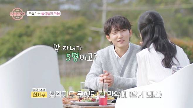 17일 방송된 MBN '돌싱글즈7' 5회에서는 호주 골드코스트에 마련된 '돌싱하우스'에 모인 돌싱남녀 10인 도형-동건-명은-성우-수하-아름-예원-인형-지우-희종이 여자들의 선택으로 진행된 '비밀도장 데이트'에 들어간 현장이 펼쳐졌다. 또한 3일 차 밤을 맞아 남자들의 '자녀 유무'가 공개됐는데, 다섯 명 모두가 "아이가 없다"고 밝힌 가운데 돌싱녀들의 표정이 복잡미묘하게 변해 향후 러브라인에 대한 궁금증을 키웠다.