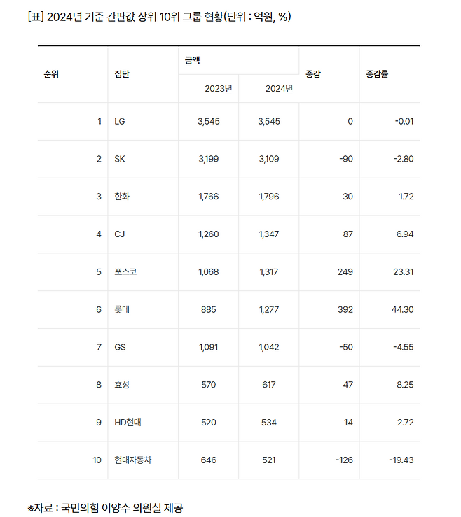 지난해 사용료를 가장 많이 받은 그룹은 LG로 3545억원 규모였다. 이어 SK(3109억원), 한화(1796억원), CJ(1347억원), 포스코(1317억원), 롯데(1277억원), GS(1042억원), 효성(617억원), HD현대(534억원), 현대자동차(521억원) 순이었다. 1000억원 이상 간판값을 챙긴 기업은 모두 7곳이었다.