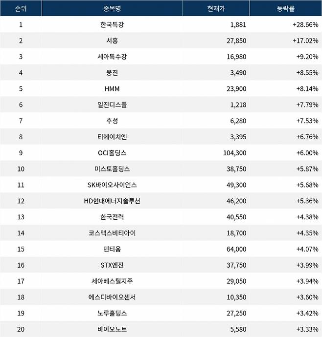 이어 상승률 2위 서흥(008490)은 현재가 27,850원으로 주가가 17.02% 급등하고 있다. 상승률 3위 세아특수강(019440)은 현재 16,980원으로 9.20% 상승하며 긍정적인 모습을 보이고 있다. 상승률 4위 웅진(016880)은 8.55% 상승하며 3,490원에 거래되고 있다. 상승률 5위 HMM(011200)은 8.14%의 상승세를 타고 23,900원에 거래되고 있다.