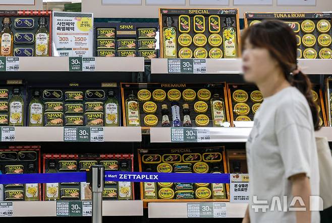 [서울=뉴시스] 정병혁 기자 = 추석 연휴를 앞두고 대형마트들이 이른 선물세트 사전예약을 시작한 가운데 18일 서울 중구 롯데마트 서울역점에 추석 선물세트가 진열되어 있다. 2025.08.18. jhope@newsis.com